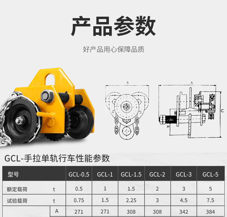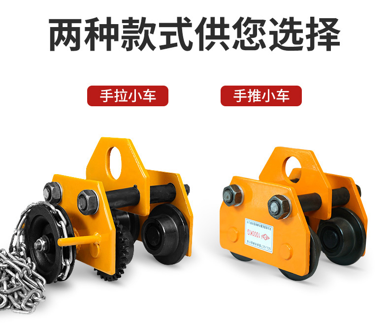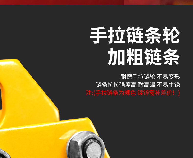 ● 锻造齿轮:手拉跑车通过手拉链条带动齿轮转动,齿轮咬合紧密,操作简单快速● 加粗链条:耐磨手拉链轮,不易变形,链条抗拉强度高、耐高温、不易生锈● 防锈防腐:表面喷塑处理工艺、美观、防锈、防腐