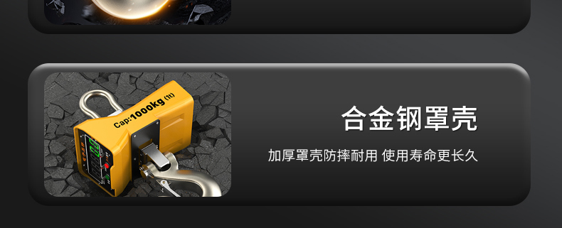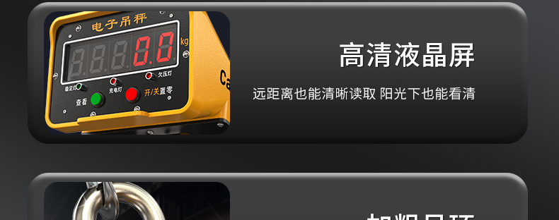 ● 升级高精度传感器,称重精准,稳定性高● 高强度加粗吊环,长时间悬挂不变形,坚固耐用● 防脱锁片,使用更安全● 无线遥控器远程操作,去皮、累加查询及关机操作● 高清LED大屏,户外也能清晰读数