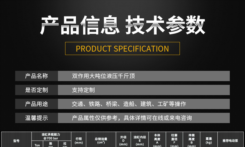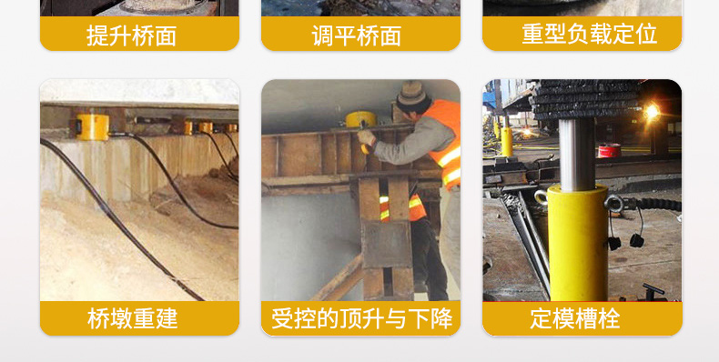 ● 坚固不漏油、不爆缸; ● 可垂直、水平、倒立,多角度使用; ● 搭配高压油泵站,可实现推、拉、挤、压等多种形式作业; ● 产品用途交通、 铁路、桥梁、造船、建筑、工矿等作业。