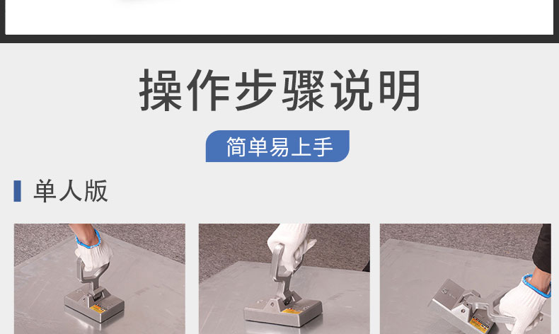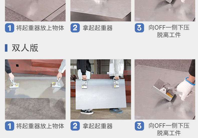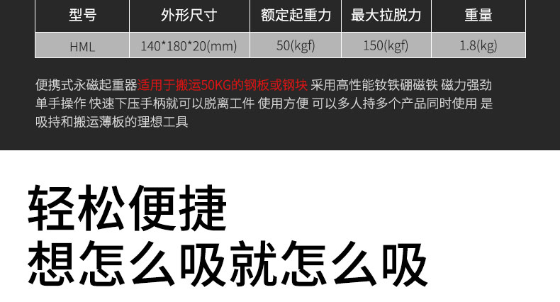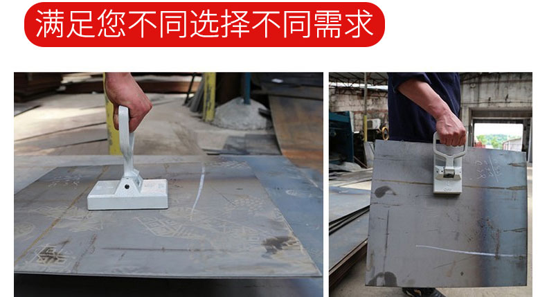 产品介绍便携式永磁起重器适用于搬运50KG的钢板或钢块,采用高性能钕铁硼磁铁,磁力强劲,单手操作,快速下压手柄就可以脱离工件,使用方便,可以多人持多个产品同时使用,手提式磁铁是吸持和搬运薄板的理想工具。