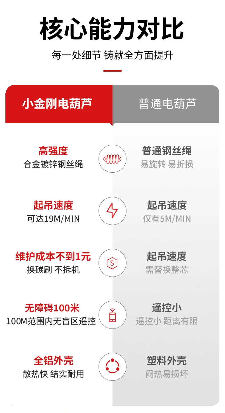 小金刚电动葫芦是钢丝绳电动葫芦的一种,又称迷你电动葫芦,悬挂端双保险设计,可以保证安装的稳固性。小金刚电动葫芦外形美观,体积小、自重轻、小巧玲珑,适合于工程吊挂,工厂吊重作业,土木水电配管装设,仓储入货,酒店商场吊升和高层吊装等,用途广泛。
